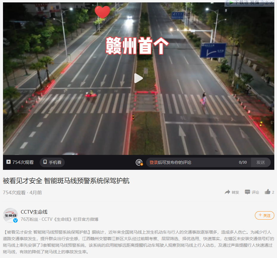 【被看見才安全 智能斑馬線預警系統保駕護航】 據統計,近年來全國斑馬線上發生機動車與行人的交通事故逐漸增多,造成多人傷亡。為減少行人道路交通事故發生,提升群眾出行安全感,江西贛州交警蓉江新區大隊經過前期考察、層層篩選、擇優選用、快速落實,在轄區未安裝交通信號燈的斑馬線上率先安裝了3套智能斑馬線預警系統,該系統的啟用能夠遠距離提醒機動車駕駛人觀察到斑馬線上行人動態,及通過聲音提醒行人快速通過斑馬線,有效的降低了斑馬線上的事故發生率。
